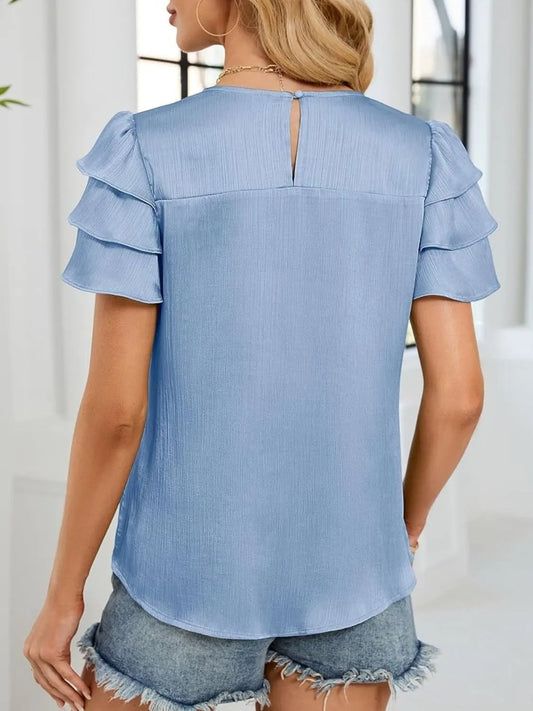 Smocked Round Neck Ruffled Layered Sleeve Blouse