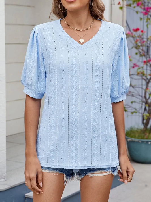 Puff Sleeve V-Neck Eyelet Lace T-Shirt