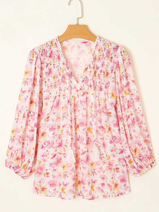 Floral Print Tassel Tie Smocked Puff Sleeve Blouse